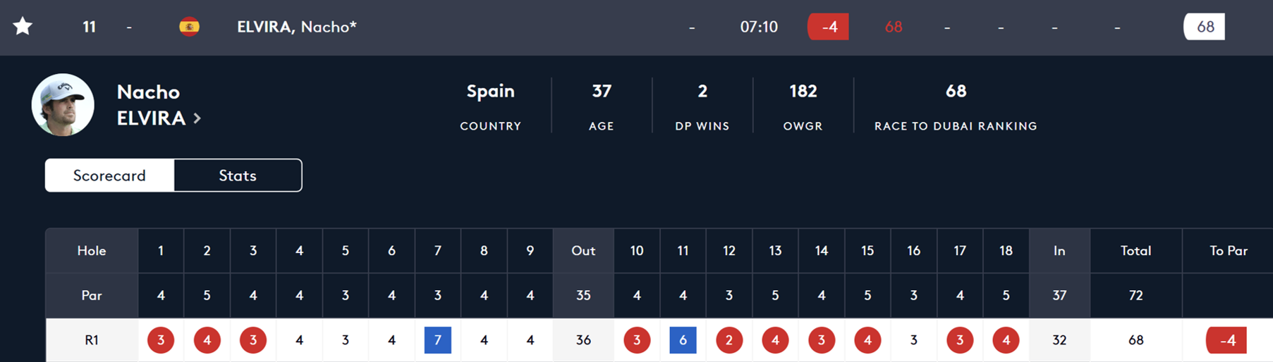 Primer recorrido de Nacho Elvira (CM Llanes) en el Alfred Dunhill Championship, completando los dieciocho hoyos con 68 golpes, cuatro bajo par de Leopard Creek CC, con 10 birdies, un cuadruple bogey y un doble bogey en su tarjeta.