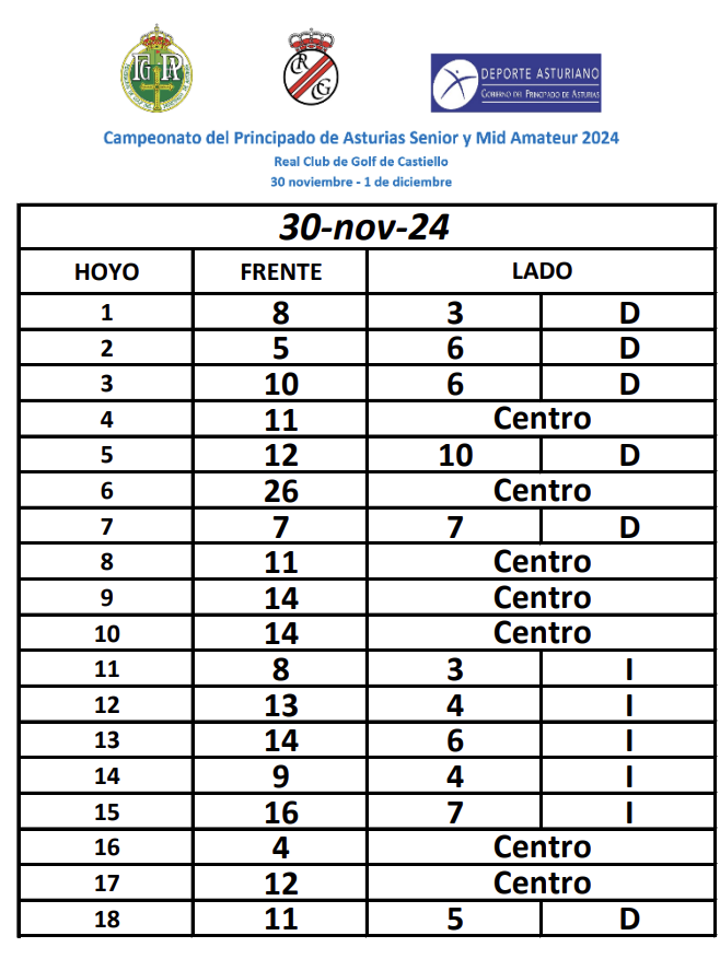 La FGPA, en aras de una mejor organización y tras recibir una serie de bajas para el torneo, ha decidido la confección de un NUEVO HORARIO DE SALIDA 1ª JORNADA del Campeonato del Principado de Asturias Senior y Mid Amateur 2024 que se va a celebrar los próximos 30 de noviembre y 1 de diciembre en el RCG de Castiello.