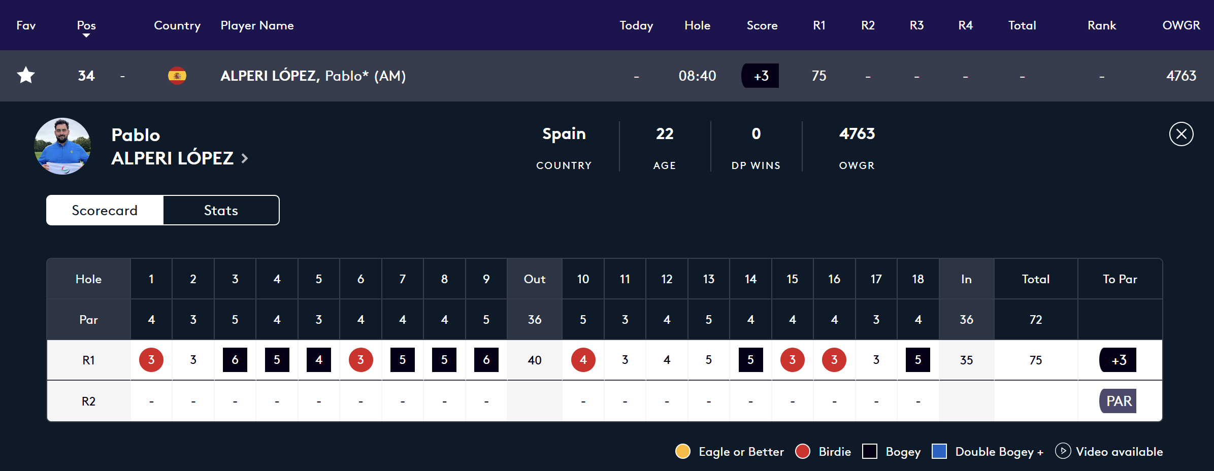 Con una vuelta de 69 golpes en la segunda ronda, menos tres, Pablo Alperi López (RCG Castiello) sube hasta la decimosexta posición del la First Stage - Hulencourt (PQ DP World Tour) con 144 golpes, par del campo en los 36 hoyos disputados del torneo.