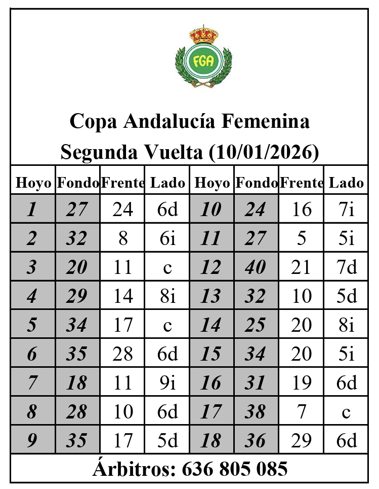 Horario de Salida 1ª Jornada de la Copa Andalucía Femenina 2026, prueba puntuable para el WAGR Femenino y para el Ranking Nacional Absoluto y Sub 18 Femenino 2026, se va a celebrar del 9 al 12 de enero en Sherry Golf Jerez.