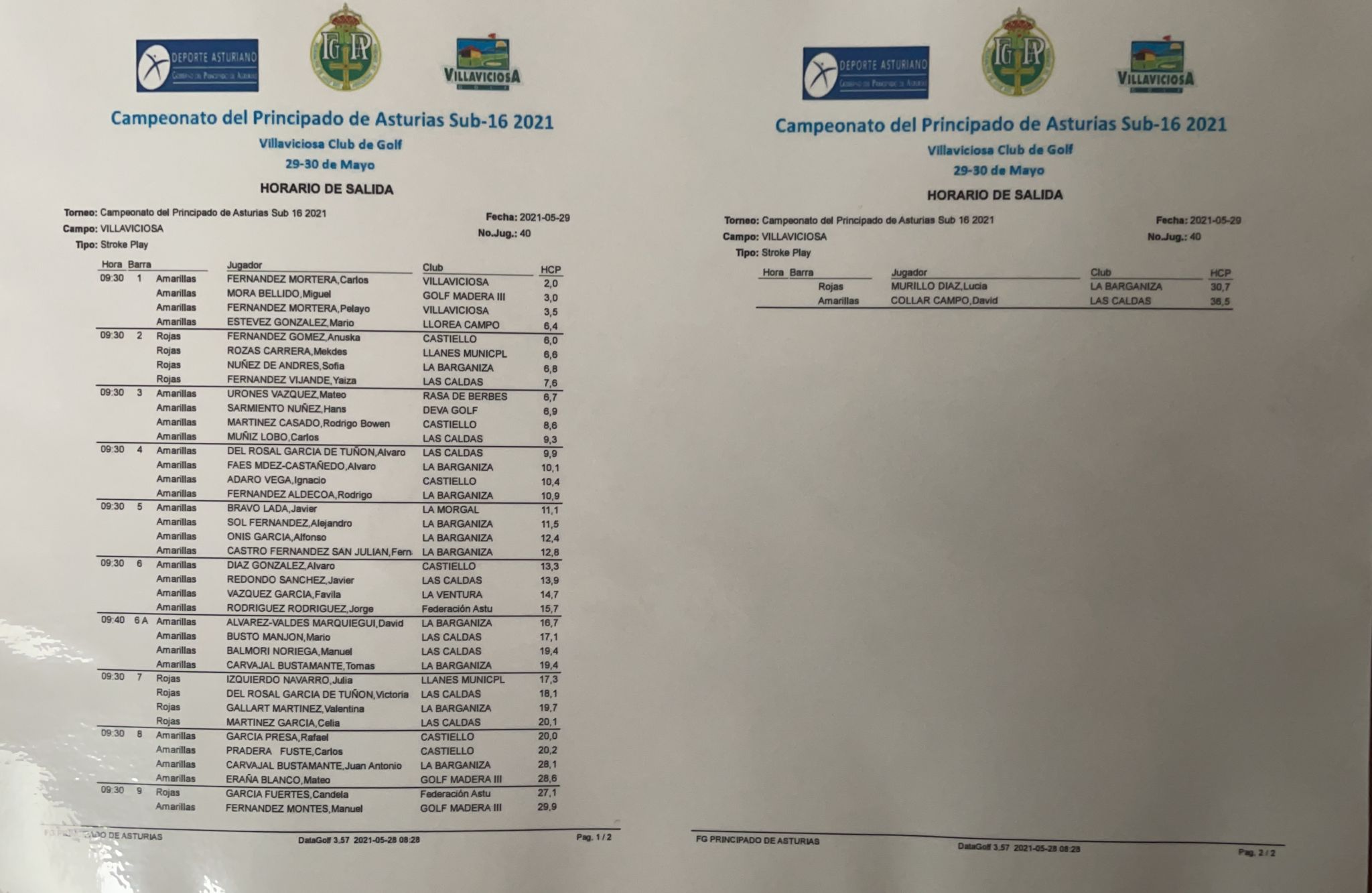 Horario de Salida 1ª Jornada Campeonato del Principado de Asturias Sub 16 2021