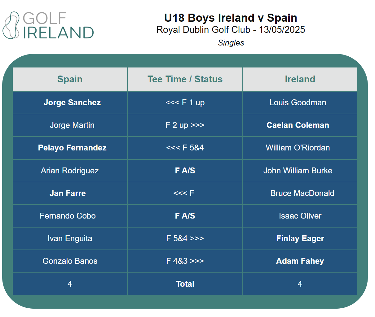 Irlanda se impone a España por un apretado 10,5 & 9,5 Martes, 13 mayo 2025 Livescoring Resultados Individuales 2ª jornada Resultados Foursome 2ª jornada Resultados 1ª jornada