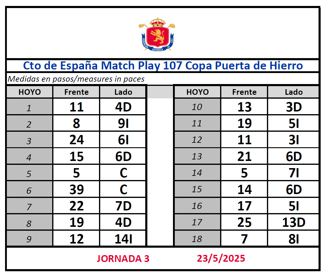 La 107ª Copa Puerta de Hierro se queda sin asturianos Jueves, 22 mayo 2025 Livescoring Resultados Stroke Play 22 mayo (PDF) Cuadro de Match Play Horario 23 mayo Posición de Bandera 23 mayo